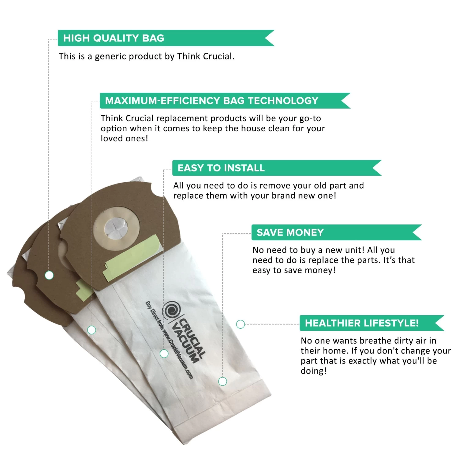 Please note the following important information about this product from Think Crucial: (i) it is a generic replacement, NOT a Eureka® Original Equipment Manufacturer (OEM) product; (ii) because it is not a Eureka® OEM product, it is not covered by any Eureka® guarantee or warranty; (iii) use of this generic replacement may violate or void Eureka’s® guarantee or warranty – it is entirely your responsibility to check, and entirely your risk if you decide to use this product; (iv) we do not guarantee or warrant that this generic replacement is compatible with any product from Eureka® or any other provider. Please check your manufacturer’s warranty with regard to the use of non-OEM parts. Think Crucial provides no warranty or guarantee with regard to the product or its compatibility with your Eureka® product. The Eureka® brand and all Eureka® trademarks belong to Eureka® or its affiliates, and are used here only to explain the compatibility features of the generic replacement product.