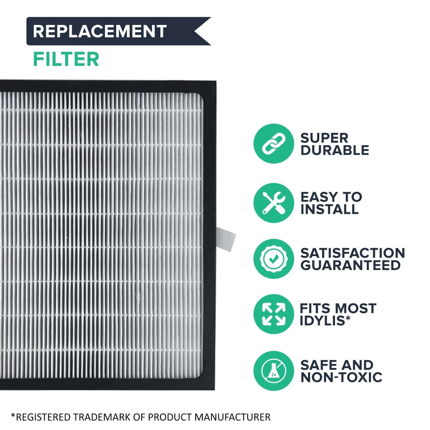 Please note the following important information about this product from Think Crucial: (i) it is a generic replacement, NOT an Idylis® Original Equipment Manufacturer (OEM) product; (ii) because it is not an Idylis® OEM product, it is not covered by any Idylis® guarantee or warranty; (iii) use of this generic replacement may violate or void Idylis’s® guarantee or warranty – it is entirely your responsibility to check, and entirely your risk if you decide to use this product; (iv) we do not guarantee or warrant that this generic replacement is compatible with any product from Idylis® or any other provider. Please check your manufacturer’s warranty with regard to the use of non-OEM parts. Think Crucial provides no warranty or guarantee with regard to the product or its compatibility with your Idylis® product. The Idylis® brand and all Idylis® trademarks belong to Idylis® or its affiliates, and are used here only to explain the compatibility features of the generic replacement product.