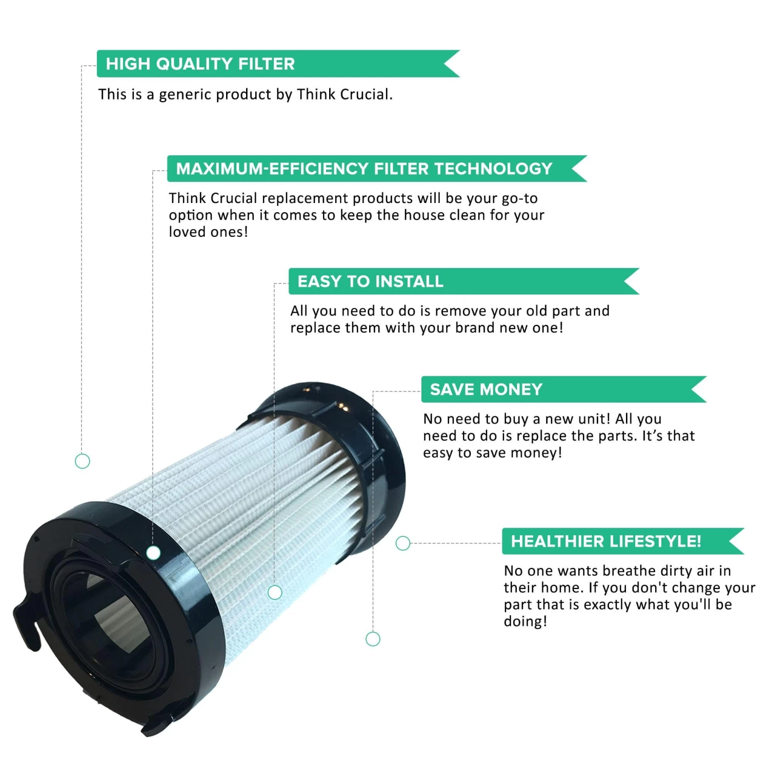 Please note the following important information about this product from Think Crucial: (i) it is a generic replacement, NOT a Eureka® Original Equipment Manufacturer (OEM) product; (ii) because it is not a Eureka® OEM product, it is not covered by any Eureka® guarantee or warranty; (iii) use of this generic replacement may violate or void Eureka’s® guarantee or warranty – it is entirely your responsibility to check, and entirely your risk if you decide to use this product; (iv) we do not guarantee or warrant that this generic replacement is compatible with any product from Eureka® or any other provider. Please check your manufacturer’s warranty with regard to the use of non-OEM parts. Think Crucial provides no warranty or guarantee with regard to the product or its compatibility with your Eureka® product. The Eureka® brand and all Eureka® trademarks belong to Eureka® or its affiliates, and are used here only to explain the compatibility features of the generic replacement product.