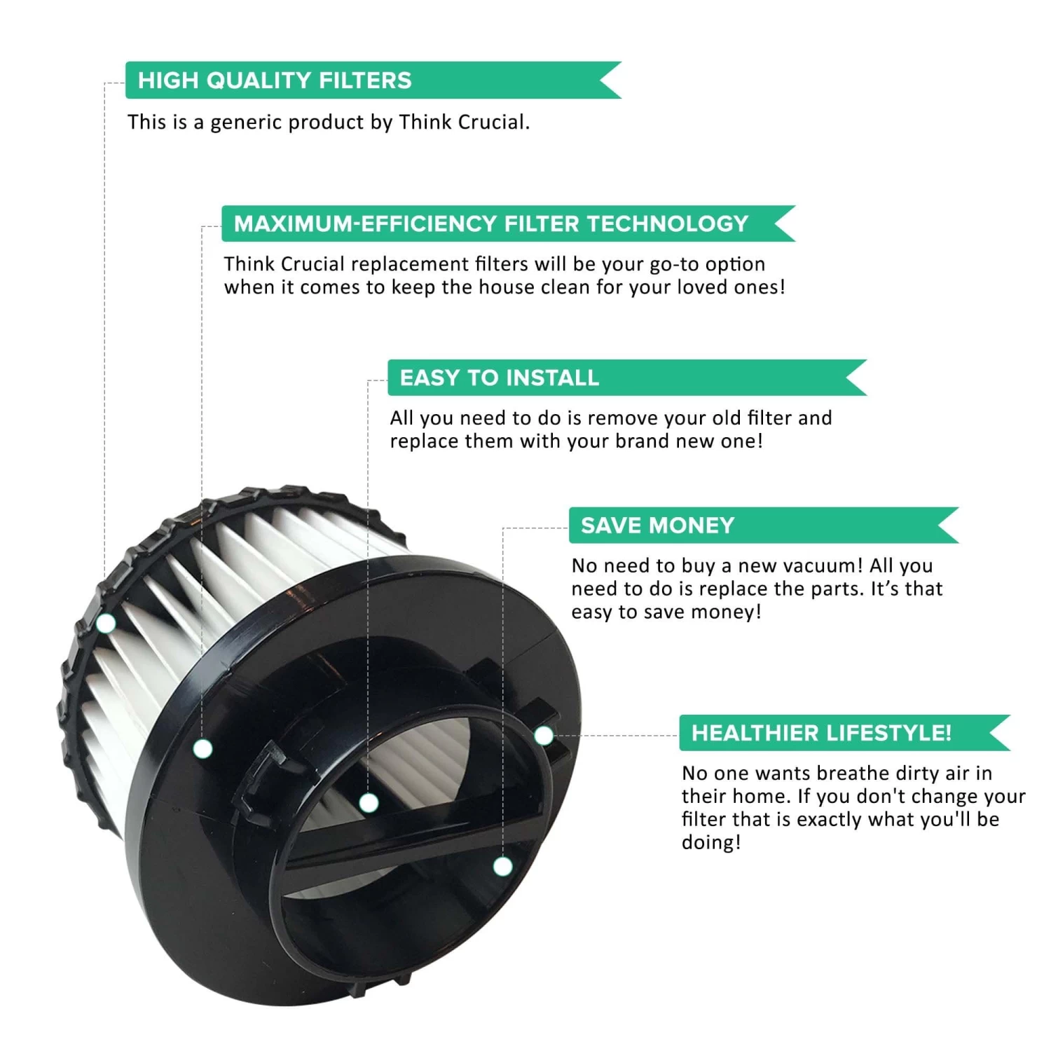 Please note the following important information about this product from Think Crucial: (i) it is a generic replacement, NOT a Dirt Devil® Original Equipment Manufacturer (OEM) product; (ii) because it is not a Dirt Devil® OEM product, it is not covered by any Dirt Devil® guarantee or warranty; (iii) use of this generic replacement may violate or void Dirt Devil’s® guarantee or warranty – it is entirely your responsibility to check, and entirely your risk if you decide to use this product; (iv) we do not guarantee or warrant that this generic replacement is compatible with any product from Dirt Devil® or any other provider. Please check your manufacturer’s warranty with regard to the use of non-OEM parts. Think Crucial provides no warranty or guarantee with regard to the product or its compatibility with your Dirt Devil® product. The Dirt Devil® brand and all Dirt Devil® trademarks belong to Dirt Devil® or its affiliates, and are used here only to explain the compatibility features of the generic replacement product.