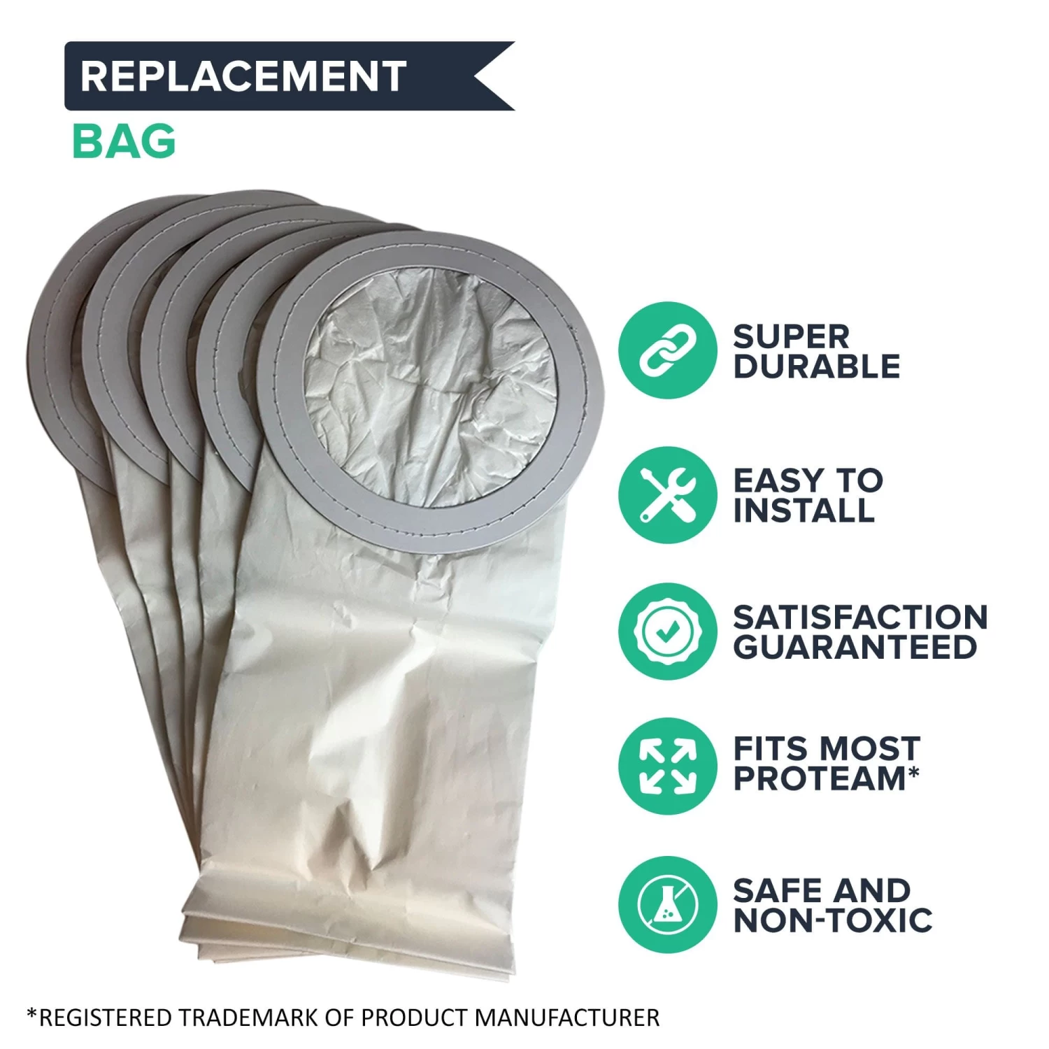Whip flooring and carpet into shape when you replace the old vacuum bags in your ProTeam 10 Quart vacuums with these high efficiency replacements. With 672 square inches of filter media in each bag, you get professional quality allergen filtration for clean air and cleaner floors. ProTeam 10 quart vacuum cleaner bags.