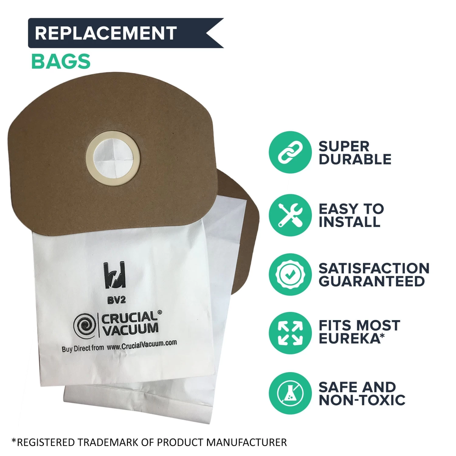 Please note the following important information about this product from Think Crucial: (i) it is a generic replacement, NOT a Eureka® Original Equipment Manufacturer (OEM) product; (ii) because it is not a Eureka® OEM product, it is not covered by any Eureka® guarantee or warranty; (iii) use of this generic replacement may violate or void Eureka’s® guarantee or warranty – it is entirely your responsibility to check, and entirely your risk if you decide to use this product; (iv) we do not guarantee or warrant that this generic replacement is compatible with any product from Eureka® or any other provider. Please check your manufacturer’s warranty with regard to the use of non-OEM parts. Think Crucial provides no warranty or guarantee with regard to the product or its compatibility with your Eureka® product. The Eureka® brand and all Eureka® trademarks belong to Eureka® or its affiliates, and are used here only to explain the compatibility features of the generic replacement product.