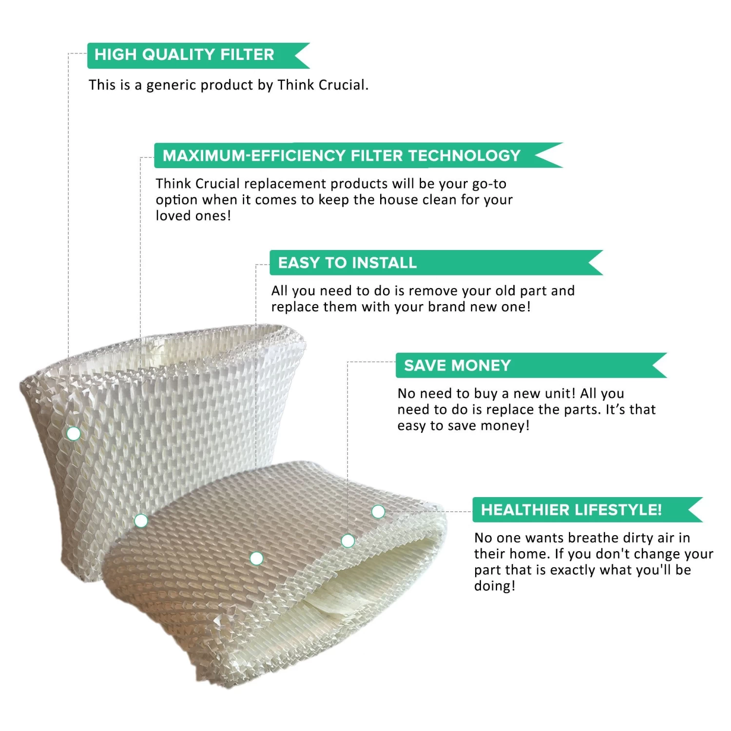 Please note the following important information about this product from Think Crucial: (i) it is a generic replacement, NOT a Honeywell® Original Equipment Manufacturer (OEM) product; (ii) because it is not a Honeywell® OEM product, it is not covered by any Honeywell® guarantee or warranty; (iii) use of this generic replacement may violate or void Honeywell’s guarantee or warranty – it is entirely your responsibility to check, and entirely your risk if you decide to use this product; (iv) we do not guarantee or warrant that this generic replacement is compatible with any product from Honeywell® or any other provider. Please check your manufacturer’s warranty with regard to the use of non-OEM parts. Think Crucial provides no warranty or guarantee with regard to the product or its compatibility with your Honeywell® product. The Honeywell® brand and all Honeywell® trademarks belong to Honeywell® or its affiliates, and are used here only to explain the compatibility features of the generic replacement product.