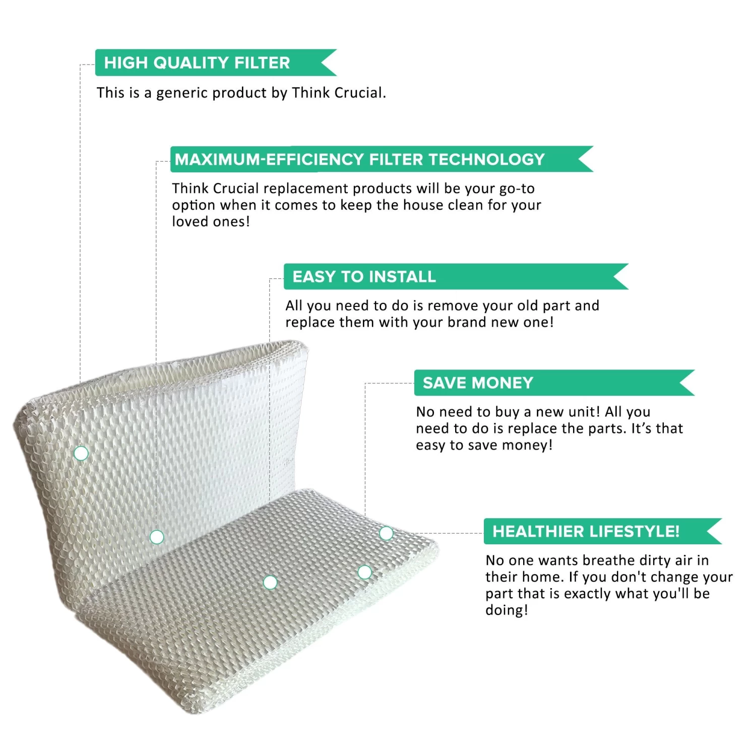 Please note the following important information about this product from Think Crucial: (i) it is a generic replacement, NOT a Honeywell® Original Equipment Manufacturer (OEM) product; (ii) because it is not a Honeywell® OEM product, it is not covered by any Honeywell® guarantee or warranty; (iii) use of this generic replacement may violate or void Honeywell’s guarantee or warranty – it is entirely your responsibility to check, and entirely your risk if you decide to use this product; (iv) we do not guarantee or warrant that this generic replacement is compatible with any product from Honeywell® or any other provider. Please check your manufacturer’s warranty with regard to the use of non-OEM parts. Think Crucial provides no warranty or guarantee with regard to the product or its compatibility with your Honeywell® product. The Honeywell® brand and all Honeywell® trademarks belong to Honeywell® or its affiliates, and are used here only to explain the compatibility features of the generic replacement product.
