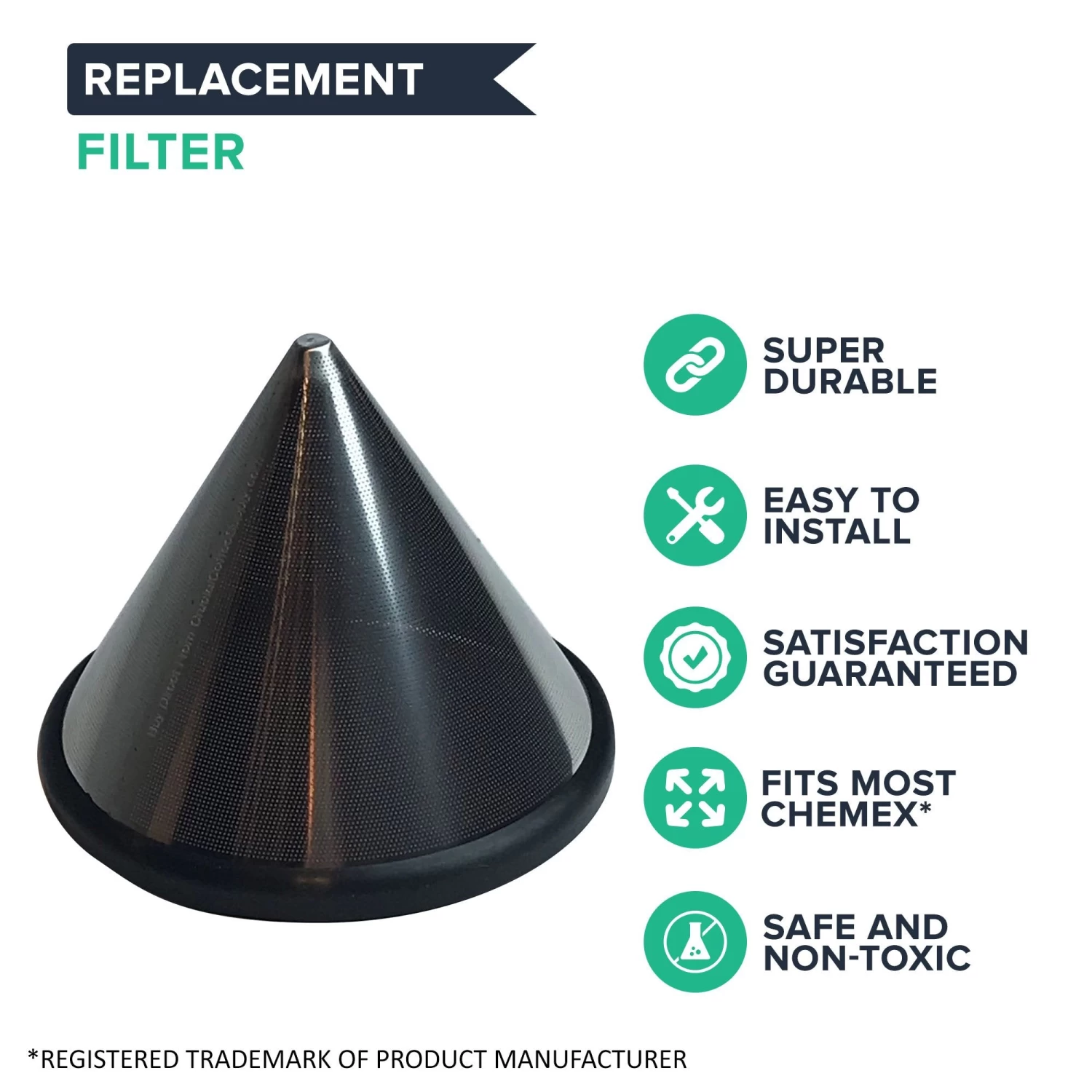 Please note the following important information about this product from Think Crucial: (i) it is a generic replacement, NOT a Chemex® Original Equipment Manufacturer (OEM) product; (ii) because it is not a Chemex® OEM product, it is not covered by any Chemex® guarantee or warranty; (iii) use of this generic replacement may violate or void Chemex® guarantee or warranty – it is entirely your responsibility to check, and entirely your risk if you decide to use this product; (iv) we do not guarantee or warrant that this generic replacement is compatible with any product from Chemex® or any other provider. Please check your manufacturer’s warranty with regard to the use of non-OEM parts. Think Crucial provides no warranty or guarantee with regard to the product or its compatibility with your Chemex® product. CHEMEX® is a registered trademark of Chemex Corporation, and are used here only to explain the compatibility features of the generic replacement product.